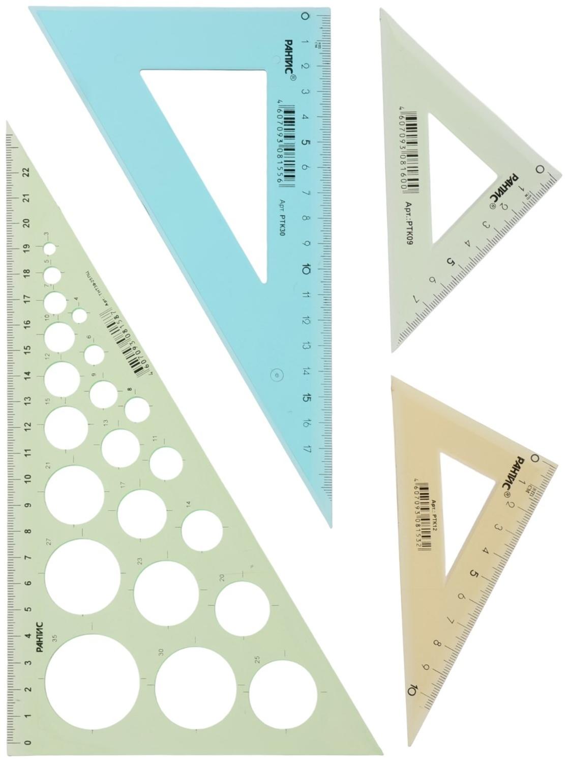 Набор треугольников 4 шт. Calligrata  катет 9/12/20/25 см, с окружностями, прозрач., цветные 1034523