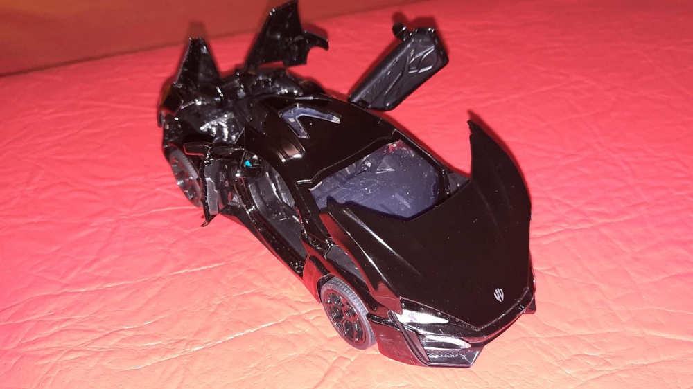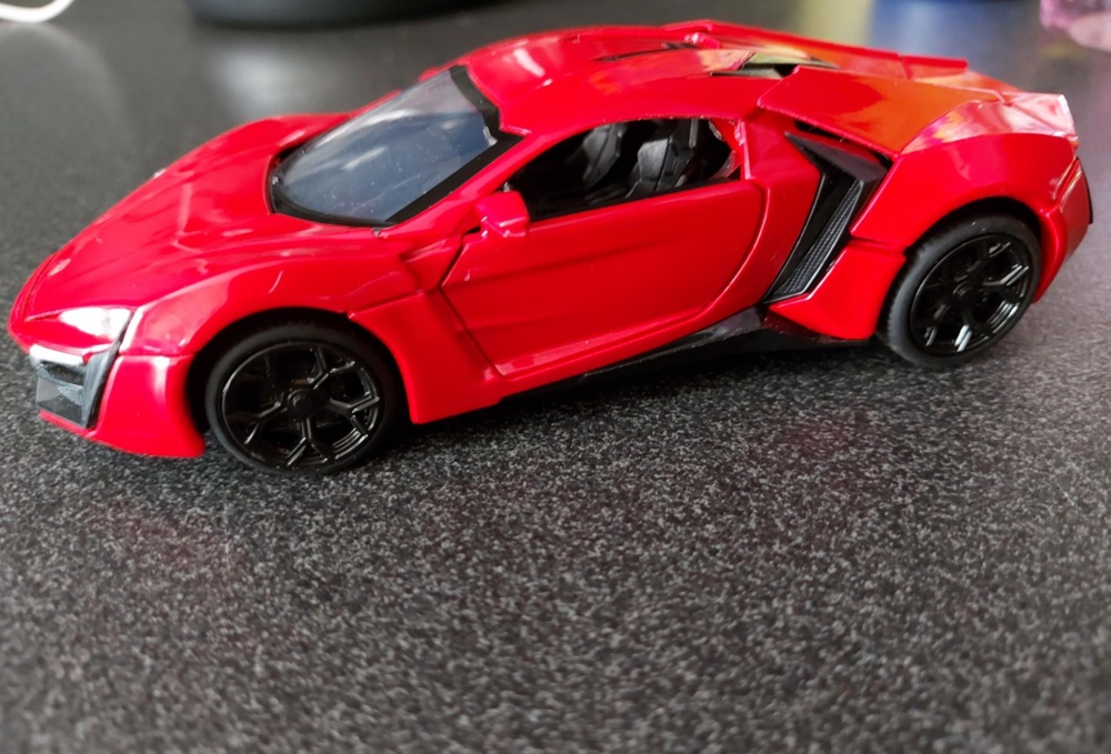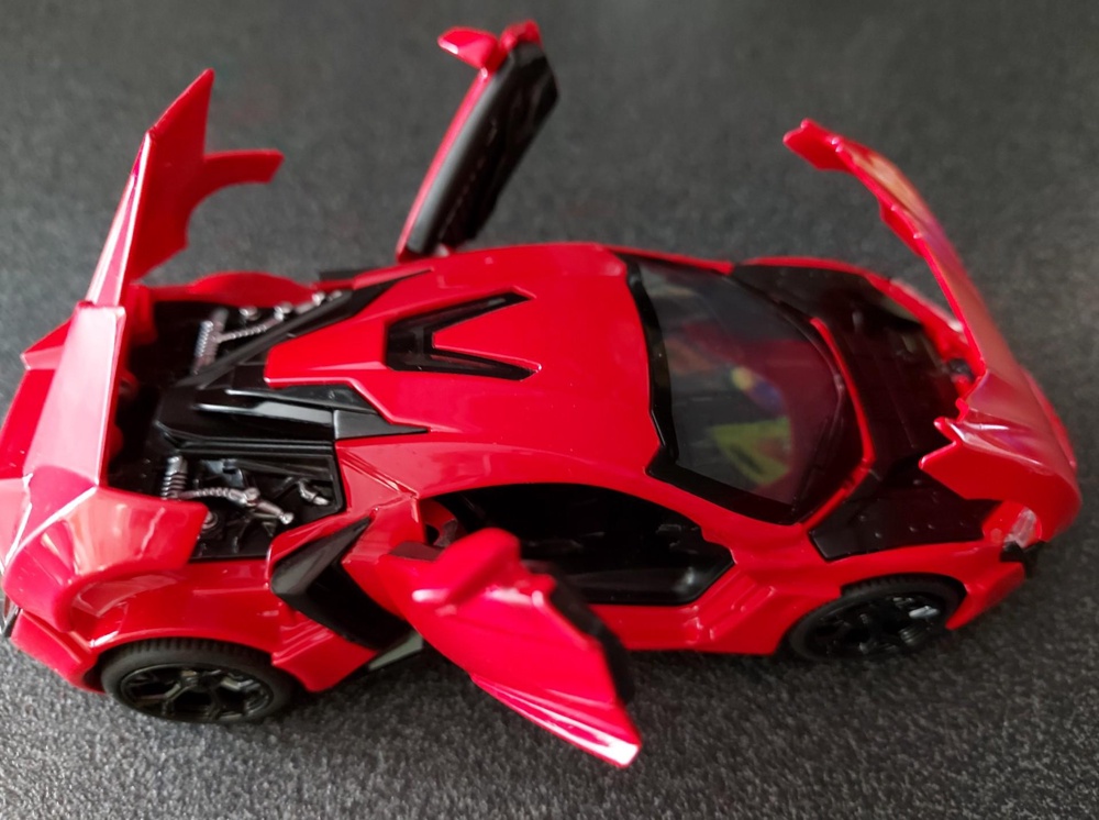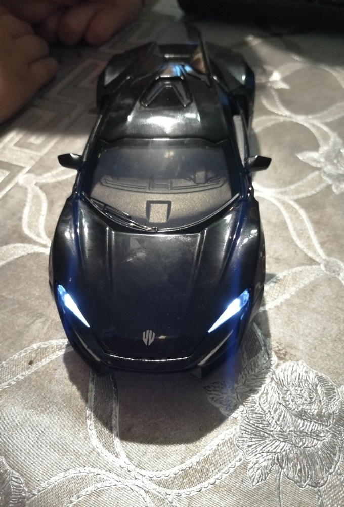 Металлическая модель Ликан от производителя Che Zhi выполнена в масштабе 1/24 и имеет длину 21 сантиметр. Открываются двери, капот и багажник. Двери у этой модели открываются очень необычным способом - задом наперед. Вы можете аккуратно потянуть за боковое зеркало вверх, и немного наружу. И сможете "вытянуть" дверь. Крышки переднего и заднего капотов также открывается необычно - "задом наперед". Кто играл с машинкой Ламборгини Миура Хота, тот понимает о чем речь. Этот Lykan выполнен с прекрасной детализацией. Радуют взгляд многочисленные маленькие подробности - как внутри салона, так и снаружи, и под капотами.